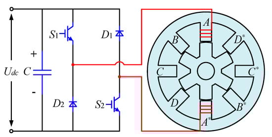 An SRM is a doubly salient variable reluctance motor, and the salient poles of the rotor are laminated with ordinary steel sheets [16,17,18,19,20,21,22,23,24,25,26,27]. The structure of the SRM is shown in Figure 1. Here, the phase-A is taken as an example to illustrate its working principle. When the rotor of the SRM is in the position, as shown in Figure 1, switches S1 and S2 are turned on to excite phase-A to form the S1-A-A*-S2 loop, the phase-A excitation current flow diagram is shown in Figure 2a. Once S1 and S2 are turned off, the energy stored in the phase-A winding is fed back to the DC power supply through the freewheeling diode, the phase-A freewheeling current flow diagram is shown in Figure 2b. The phase-A current waveform is shown in Figure 3.