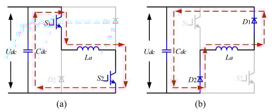 During the freewheeling state, the phase-A winding forms a loop with the diode and the switches, as shown in Figure 8b. The voltage of phase-A is zero, which is expressed as