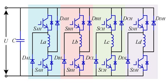 In this mode, the system can operate in two states, as shown in Figure 10. During state 1, S1 is turned off and SAH–SDL are turned on. At this point, the PV panel and electrical energy stored in the inductor are superimposed to power the four-phase winding. During state 2, S1 is turned on and SAH–SDL are turned off. At this point, the four-phase winding fed back the energy stored in the winding to the battery bank and capacitor through the diode. In this mode, the charge current of the battery bank can be flexibly controlled by controlling the duty cycles of the switches.