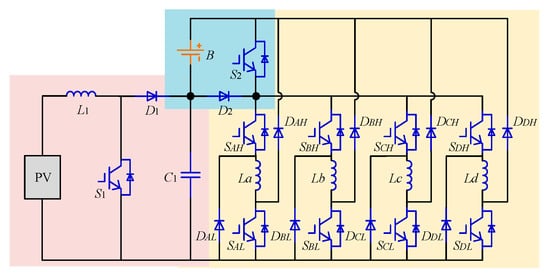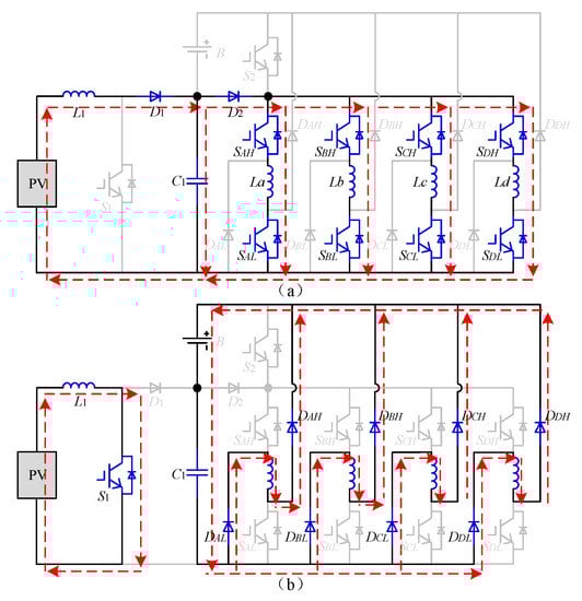 The new topology proposed in this paper adds a battery bank control converter and a PV panel boost converter based on the traditional asymmetric half-bridge converter, as shown in Figure 5. The voltage boosting function of the PV panel can be realized by controlling the on and off states of S1. Additionally, controlling the on and off states of S2 can realize multilevel control of the asymmetric half-bridge bus voltage. During the freewheeling state, the energy stored in the inductor can be fed back into the battery bank and capacitor C1 through the diode. It is easy to switch among the four modes by controlling the on and off states of S1 and S2 with the proposed converter.