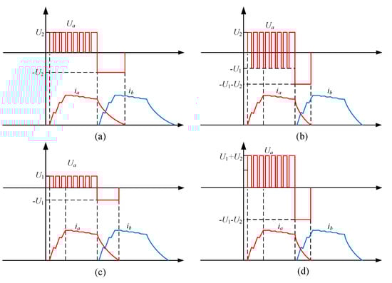The voltage chopping waveform with soft chopping control is shown in Figure 11. In the voltage chopping control mode, S1 maintains the conduction state during the whole phase-A conduction, and S2 adopts the PWM chopper control. When S2 is turned on, the voltage Udc is applied to both ends of the phase-A winding and the voltage across phase-A is the bus voltage; when S2 is turned off, the phase-A winding forms the circulating current through S1 and D1 and the voltage across the phase-A winding is zero. The average voltage applied to the phase-A is DUdc.