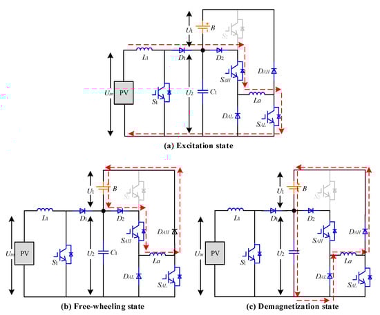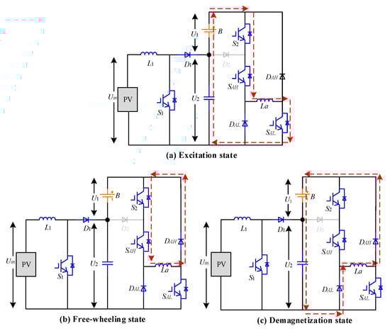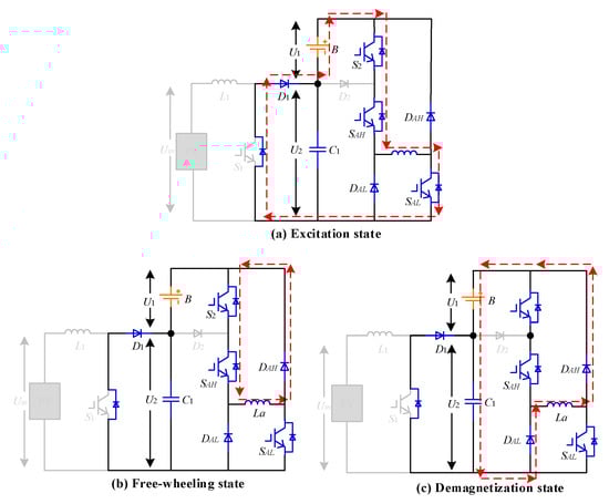 During the excitation state, the switches SAH and SAL are turned on, as shown in Figure 9a. The voltage of phase-A is equal to the sum of those on the capacitor and battery bank, which is expressed as