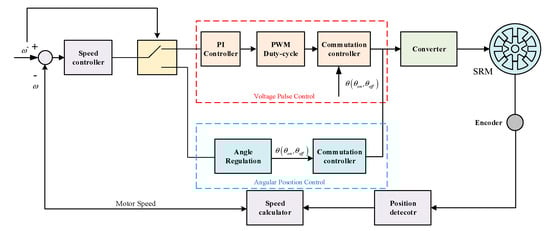 The voltage chopping control and angular position control are two basic control schemes. Different control methods are adopted according to the set speed, where the voltage chopping control scheme is adopted at low speed and the angular position control scheme is adopted at full speed. As shown in Figure 12, the motor speed is calculated by the encoder. In the voltage chopping control mode, the speed error is processed by the PI controller to adjust the rotational speed of the SRM. In the angular position control mode, the opening and closing angles vary as the error of the speed, so as to change the excitation freewheeling time of the winding.