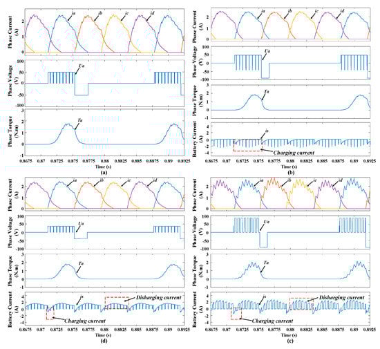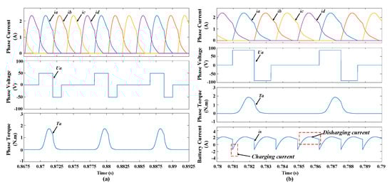 S1 and S2 are both turned on. The SRM is driven by both the PV panel and battery bank during the excitation state, and the energy stored on the windings is fed back to the front-end capacitor and battery bank during the demagnetization state. It also can realize fast demagnetization. Because the bus voltage increases, the SRM has a wider speed range and higher torque. The phase voltage and current waveforms are shown in Figure 6d.