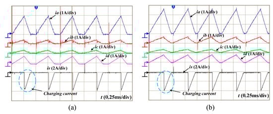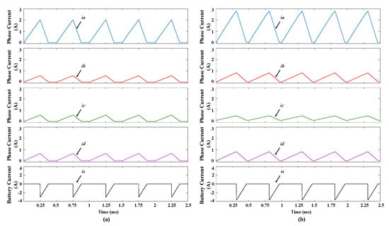Figure 20 illustrates the current waveforms when the motor is in stationary state. The switching frequency is set to 2 kHz and duty cycle is given as 50% and 60% in Figure 20a,b, respectively. All the switches are turned on simultaneously to charge the four-phase windings. Afterwards, the battery bank is charged by the energy of the phase windings while the switches are turned off simultaneously. In conclusion, because of the additional battery bank and the higher bus voltage, the battery can be flexibly charged by the external PV panel and the charging current is related to the energy stored in the four phase windings.