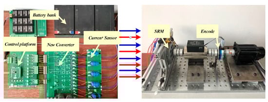 In order to demonstrate the effect of the converter, the simulation of a 500 W SRM is established with the same parameters. The experimental platform is shown in Figure 17. The novel converter, which is established with the IGBT using a fast recovery antiparallel diode inside, drives the motor. The PV panel power is simulated by the 50 V DC power which can be adjusted. In addition, three 12 V-batteries are connected in series to form a 36 V battery bank. In addition, the rotor position is determined through a 1000-line incremental encoder. The main control system is implemented by TMS320F28335 digital signal processor made by Texas Instruments. The Hall effect current sensors are employed to collected the waveforms of phase currents.