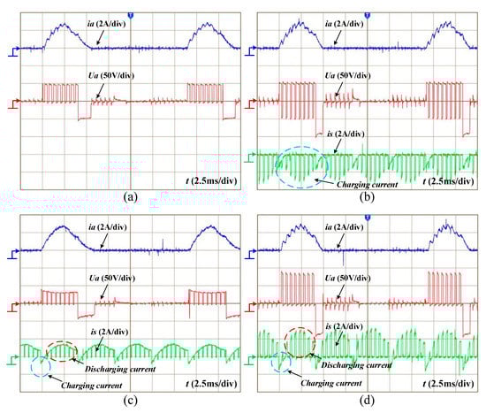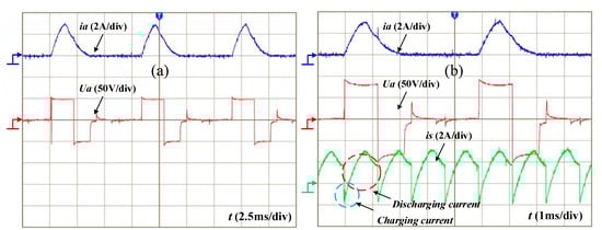When the motor is in the stationary state, the battery charging process can be flexibly achieved by the PV panel through motor windings. The waveforms of battery charging in this state is illustrated in Figure 16, where the switching frequency is given as 2 kHz and the duty is given as 50% in Figure 16a and 60% in Figure 16b. When S2 is off while SAH~SDL are on, the four-phase windings are simultaneously energized by the PV panel and the electrical energy stored in the inductor, and the phase currents rise until SAH–SDL are turned OFF. Afterwards, the battery bank is charged by the power stored in the phase windings. In conclusion, because of the additional battery bank and the higher bus voltage, the battery can be flexibly charged by the external PV panel. Besides, the charging current is related to the energy stored in the four phase windings.