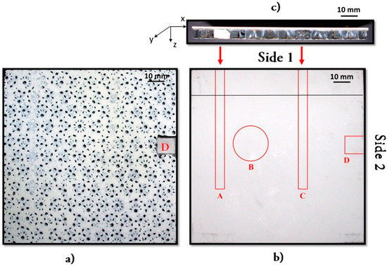 Figure 1b,c), although they seem to be cylindrical defects looking at side 1. This is caused by the fact that the materials used for the inclusions are very elastic and they adapt the shape to the cells present on the sides of the sample. Both holes were diameter (φ = 5 mm), length (L = 70 mm), and depth (z = 0.5 mm). The holes were realized by using a drill after the fabrication of the sample. Both were filled with Teflon-covered sponges, which mimic inclusions. Another fabricated defect was realized on side 2 (see defect D in