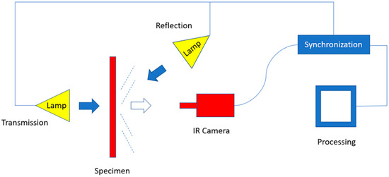 Figure 2). The distance between the lamps and the detected surface was about 1.2 m. Thermal changes were acquired using a cooled focal plane array infrared camera (Phoenix, InSb, 3 to 5 μm) with a 640 × 512 pixels array. A synchronization unit was needed to control the time between the launch of the thermal pulse and recording. Data was stored as a 3D matrix where