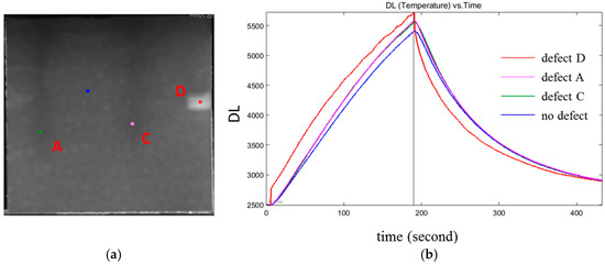 Figure 3a). The temperature over time of the three defects A, C, and D, and non-defective area appear in