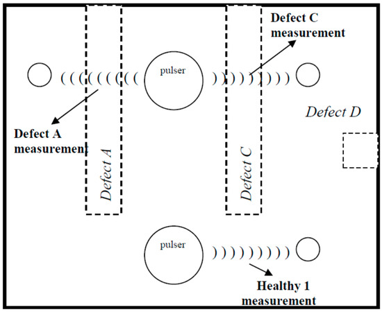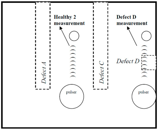 Figure 6. The pulser and receiver distance was always carefully kept constant for the measurements between the healthy and the defected state. In the measurements of defects A and C, and the healthy area, the two sensors were kept 45 mm apart (