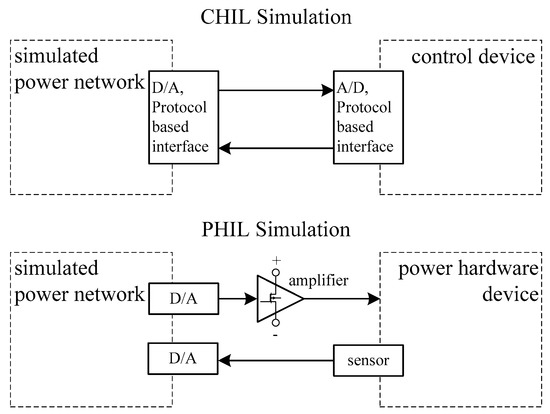 Real-time hardware in the loop (HIL) simulation is gaining significant attention as an advanced power system testing method [11,97,98,99,100]. It allows the connection of a physical device to a power system that is simulated in real-time in a digital real-time simulator (DRTS). Exhaustive testing can be achieved in realistic, flexible, controllable, and repeatable conditions that allow de-risking equipment. The two main categories of HIL simulation are shown in Figure 1. In CHIL simulation, a hardware controller is connected to a simulated system executed in the DRTS. In PHIL simulation, a physical power device (e.g., motor, inverter) is connected to a real-time simulated system. In PHIL simulation, a power interface consisting of a power amplifier and sensor is required in order to connect the hardware under test with the DRTS. The voltage of the common node between the simulation and hardware is amplified and applied on the hardware under test. The measured current of the hardware under test is fed back to the DRTS and is inserted in a controllable current source in the real-time simulation. Stability and accuracy issues arise during PHIL simulation due to the non-ideal power interface, which needs to be considered.