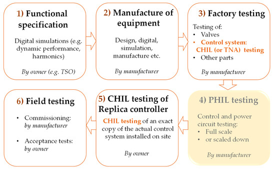 Figure 2 summarizes the development and testing stages of FACTSs that were described in Section 3.1 (i.e., functional specification, factory testing, and field testing), including advanced approaches, such as the CHIL testing of the control system by the manufacturer and the CHIL testing of a replica controller by the owner, as presented in Section 3.2. Moreover, the option of performing the proposed PHIL tests (full scale or scaled-down) is included as a new step after the CHIL testing by the manufacturer.