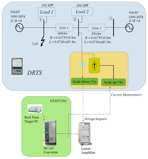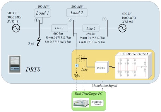 The Electric Energy Systems laboratory of the National Technical University of Athens (NTUA) operates a DRTS by RTDS Technologies Inc. (including 2 GPC processors), which allows the simulation of switching phenomena in small time-steps in the range of 1 to 4 μs. A transmission system was designed in the DRTS, as shown in Figure 3. A 3-level 3-phase DC/AC voltage source converter of a 100 MVA STATCOM, including DC bus, filters, and transformer, was simulated in the DRTS, while its control algorithm was executed on a hardware controller. Voltage and current measurements from the real-time simulation were fed to the hardware controller, which returned the modulation signal to the simulated DC/AC converter. It should be noted that the conversion of the modulation signal to PWM pulses was performed in the real-time simulation, in order to match the operation of the actual voltage source converter used for PHIL tests in Section 3.3.2. The control algorithm of the STATCOM aims to provide dynamic and steady state voltage control by comparing the locally measured grid voltage (bus 2) with a reference voltage and providing or absorbing reactive power. The model of the STATCOM was based on [120] using the following values for the proportional integral (PI) controller of the outer AC voltage control loop: Ki = 1000, Kp = 10.
