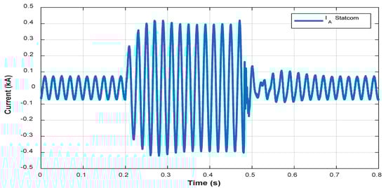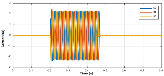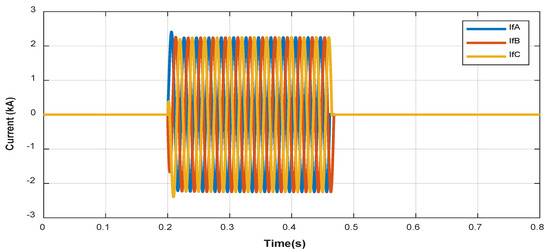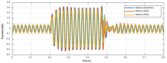 A 3-phase symmetrical fault occurred at bus 1, which was cleared after 13 cycles (fault impedance equals to 100 Ohm resistive). CHIL tests were performed and the results are described below. The 3-phase current at the faulted bus is shown in Figure 4. Figure 5 shows the increase of the current of the STATCOM during the fault in order to provide voltage control, where only one phase is shown in order to facilitate comparison with the PHIL tests in Section 3.3.2 (in the PHIL test, a hardware single-phase voltage source converter was used).