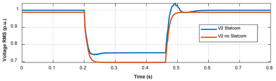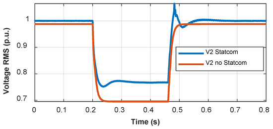 Voltage of bus 2 during the short circuit, with and without the STATCOM (CHIL test).
