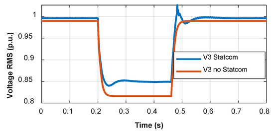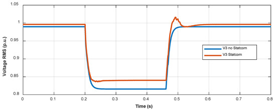 Voltage of bus 3 during the short circuit with and without the STATCOM (CHIL test).