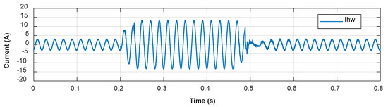 The CHIL tests of Section 3.3.1 were repeated in a PHIL configuration. Figure 10 shows the current at the faulted bus during the short circuit in the PHIL test, which is very similar to the CHIL test. Figure 11 shows the current of the actual voltage source converter before, during, and after the fault is cleared, measured by the aforementioned current probe and obtained from the software of the DRTS. This current was scaled up in the DRTS and was injected in the simulated power system via a controllable current source.
