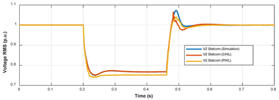 The voltages of bus 2 and bus 3 during the short circuit, with and without the STATCOM, are shown in Figure 12 and Figure 13. It is clear that the STATCOM manages to mitigate the voltage sag at both buses, similarly to the CHIL tests. The occurring voltages in the steady state and dynamic conditions are similar to the CHIL test (Figure 6 and Figure 7), however, there is a smaller voltage improvement under dynamic conditions (around 2 p.u less at bus 2). The smaller voltage improvement is due to less reactive power provided by the converter in the PHIL test (Figure 14), compared to the CHIL test (Figure 8). The hardware voltage source converter exhibits additional constraints on its maximum admissible current, based on its actual switching devices and power circuit. In the CHIL test, where the voltage source converter was purely simulated, this was not considered accurately. Therefore, in the PHIL test, the less reactive current allowed to mitigate the voltage sag resulted in a smaller improvement of the voltage compared to the CHIL test.