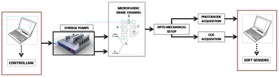 Flow diagram of the experimental set-up: the two syringe pumps, the microfluidic channel, the opto-mechanical block and the optical acquisition. Two algorithms were developed: one to control the syringe pumps actuation (Control Law) and the other to detect the frequency of the slugs passage (Soft Sensor) in the straight part of the micro-channel.