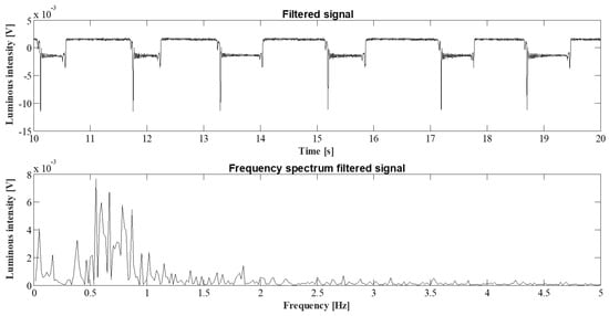 For the experiment with : (at the top) the trend of the optical signal after filtering and (at the bottom) its spectrum.