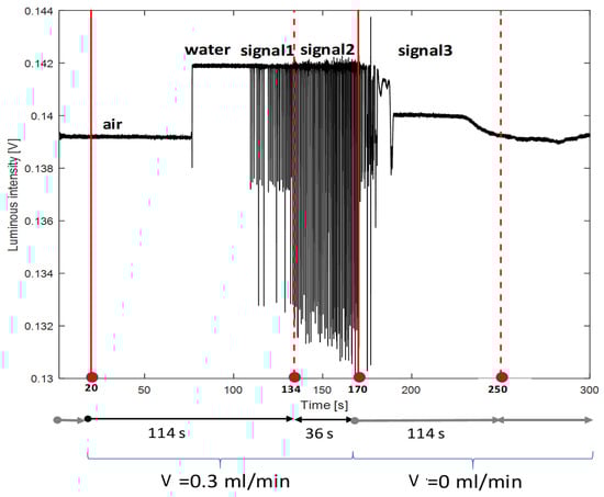Trend of the optical signal acquired in the experiment to evaluate the transient in the slug flow: time needed to modify the frequency of the slug flow by varying the input flow rate. The air and water input flow rates were set equal V = = and varied from to and then restored to zero.