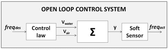 The Figure 6 shows the schematic of the open loop control system for the microfluidic process (called ): the frequency parameter () is associated with a desired flow behavior and () is its actual value computed by the signal analysis procedure represented by the algorithm Soft Sensor. Given a control law to correlate the desired frequency of slug flow with the input flow rate it is possible to compute the new input flow rate (V = = ) to be imposed at the microfluidic system. The ideal condition is verified if .