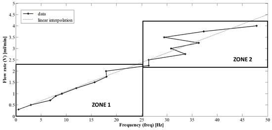 Based on the results shown in Figure 4, the peak detected per experiment () was choosen as control parameter. The Control Law was defined by the linear interpolation (dashed line) of the data in zone-1 of Figure 7 considering the manipulation variable (V) along the y-axis and the control parameter () along the x-axis. In this plot, two zones can be seen: zone-1 (in the range of flow rate [–] mL/min and frequency [–] Hz) shows a more regular behavior and a more irregular part, named zone-2 (in the range of flow rate [–] mL/min and frequency [–] Hz). The authors decided to limit this study and implementation of the control law to the zone-1. The general equation of the linear fitting can be formalized by Equation (1):