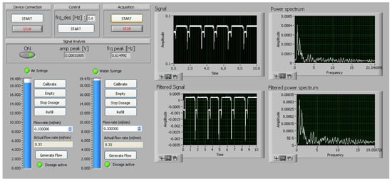 The GUI of the platform is presented in Figure 8. It consists of a section related to the pumps control and a section for the real-time monitoring of the raw and filtered signals and spectra. In the control section, it is possible to set the desired frequency of the slugs passage () and to read its actual value computed by the signal analysis procedure ().