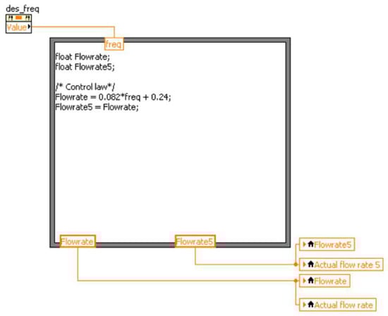 In Figure 9 it is reported the Labview schematic for the module that implements the Control Law. The input parameter is the desired frequency () set in the GUI and the output parameters are the two new flow rates to be imposed to the pumps ( and ). The communication with the pumps is implemented by a Cetoni Nemesys ad-hoc block.