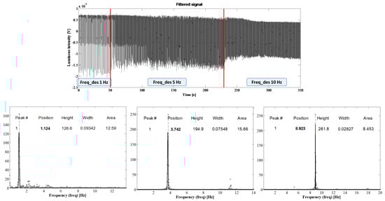 On the top of the figure the filtered signal, acquired during all the experiments and lasting , is reported. The three time windows (labeled with ) represents the trend of signal after the change of desired frequency value by the GUI. It is visible, at each change, that after a slight time interval of around the slug frequency passage is stabilized. The first portion of signal relative to the is plotted after the transition phase. Considering the signal segmented in three parts (each relative to the change of desired frequency) and neglecting the part of the signal relative to the transitory phase, the spectra were computed and plotted (lower part of Figure 11). The detected peaks are . Since the control is used in the open loop configuration, the results obtained can not be extremely precise and therefore a certain error was expected ().