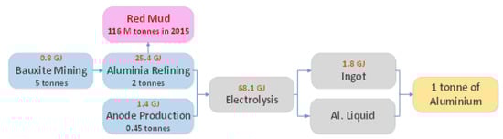 Afterward, the molten aluminum is poured into molds to solidify in different shapes, which are shipped as ingots. In some cases, liquid aluminum is transported in insulated ladles by road depending on the proximity of the foundry []. The average energy consumption for ingot casting from the range collected from the literature review is 1.81 ± 0.17 GJ per ton of aluminum (Table 4). Finally, by adding up all the energy consumed in all the different processes, the production of one ton of primary aluminum requires 98 GJ.