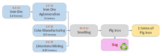 Finally, limestone is added in order to remove the impurities []. Similar to iron ore, limestone also has to be extracted from the earth, in a process that consumes close to 0.9 ± 0.5 GJ per ton (Table 8).
