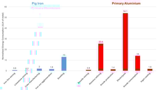In Figure 4, the various stages and their energy consumption for the production of one ton of pig iron and primary aluminum are shown. The difference in the total energy consumed to produce one ton of primary aluminum when compared to the production of the same amount of pig iron sums up to roughly 80 GJ.