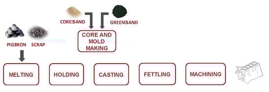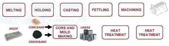 In Figure 6 and Figure 7, the process flow for manufacturing the engine blocks from CI and Al alloys, respectively, is presented. The key difference between the two process flows is the need for heat treatment in the case of Al-alloy engine blocks and the use of liners.