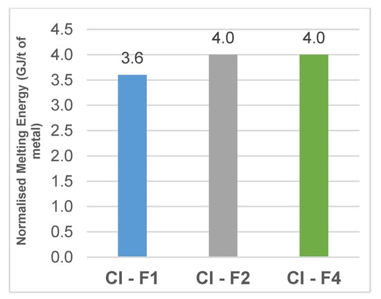 The casting temperatures for CI and Al vary around 1500 °C and 730 °C, respectively. This normally occurs in a melting furnace which can differ from foundry to foundry and/or for different metals. Normally, two types of furnaces are used: cupola and induction. By a number of foundries, it was verified that they only use cupola furnaces to produce CI engine blocks. Cupola furnaces use coke as an energy source, and their thermal efficiency ranges between 20 and 30%. The main inputs in these furnaces are pig iron (4.8%), ferrosilicon 75% Si (4%), and steel and/or CI scrap (91.2%). Unrecoverable metal losses, mainly due to oxidation, are reported by foundries, to an average of 2%. In total, three CI foundries were audited, and the energy per ton of liquid metal was measured to be 3.9 ± 0.1 GJ (Figure 8).