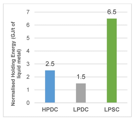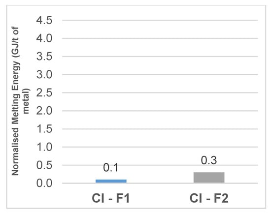 After melting, to keep the metal at casting temperature and with a consistent composition, it is transferred and kept in the holding furnace as a buffer due to different production rates. The energy per ton of liquid metal was measured to be 0.2 ± 0.1 GJ in two foundries (Figure 9). The holding furnaces in both foundries were electricity powered. One of the biggest factors in the energy consumption during the holding process is the holding time. This changes from foundry to foundry according to the production rate, casting method, and of course the type of metal. In the holding process, the foundries reported an unrecoverable metal loss of 2%.