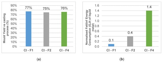 Following the casting process and the removal of the solid block from the sand mold, it has to be roughly machined to remove secondary cavities, risers, runners, and gates (also known as fettling). This excess material is usually re-melted. The mold yield reported from all three foundries was 75 ± 1% (Figure 11a). The energy consumed during the process varies significantly per foundry, and the reported values range from 0.1 to 1.4 GJ per ton of liquid metal (Figure 11b).