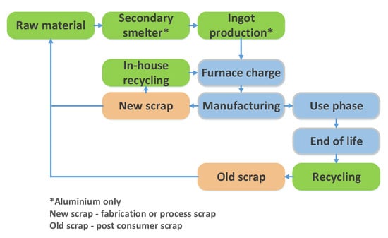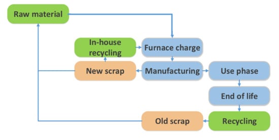 - Boin, U.M.J.; Bertram, M. Melting standardized aluminum scrap: A mass balance model for europe. JOM 2005, 57, 26–33. [Google Scholar] [CrossRef]