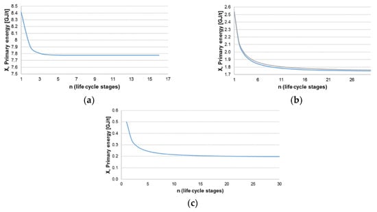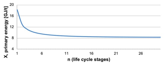 According to Equation (2), the energy burden for multiple recycling, where the material is recycled indefinitely, can be obtained by calculating the following []: