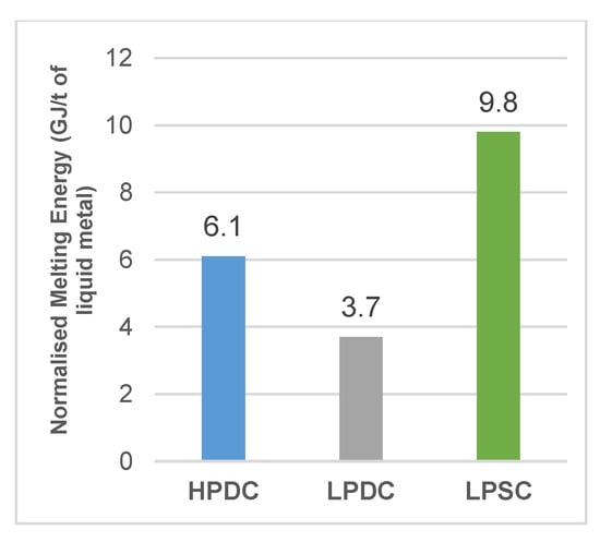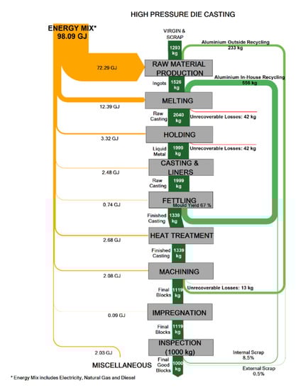 Manufacturing process efficiency can obviously have a great impact on the energy consumption during that life-cycle phase of the vehicle. Salonitis and Ball [] highlighted the importance of energy efficiency for both manufacturing processes and systems. One of the most energy-consuming manufacturing processes is casting (when considering all sub-processes such as melting, holding, finishing), and a lot of research is undertaken on how to improve its energy efficiency [,,,,]. The casting process is used in the automotive sector for the manufacturing of a number of components both in the powertrain and in the body in white (BIW). A couple of attempts were also reported on the use of different materials for the casting of automotive components [,].