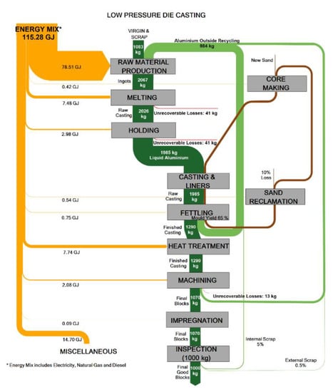 Al-alloy engine blocks are usually made from secondary ingot. The alloy used is A383 or A380 for LPDC and HPDC, and A319 for LPSC. The process of recycling Al scrap to form the alloys is by refining, a process that uses a combination of rotary and reverberatory furnaces []. The recycled Al can have similar properties to primary Al. However, in a course of multiple recycling, more and more alloying elements are introduced into the metal cycle. Secondary alloys have relatively high levels of impurities, especially iron, which is detrimental to many properties. The multiple life-cycle method is, thus, used (as in the CI recycling) for calculating an average energy consumption.