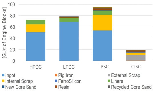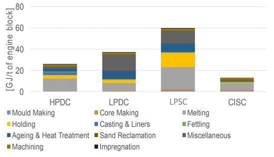 Total energy per engine block. HPDC—high-pressure die casting; LPDC—low-pressure die casting; LPSC—low-pressure sand casting; CISC—cast-iron sand casting.