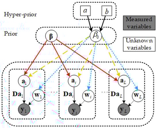 Since the hyper-parameter is shared by all L sets of vectors, will contribute to the estimation of hyperparameters , meaning the inter-relationships among the multiple spectrum vectors can be fully utilized. According to Equations (8)–(10), the MMV hierarchical Bayesian model is shown in Figure 1, and the dependence among different parameters in the probability model is also shown.