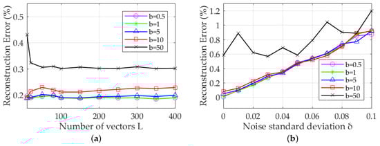 From Figure 4a, when the number of spectrum vectors increases, the reconstruction error is stable, and the reconstruction error is proportional to b. It can be seen from Figure 4b that the reconstruction error increases with the noise standard deviation . When the value of b is set below 10, the reconstruction error will not be affected by the parameter b.