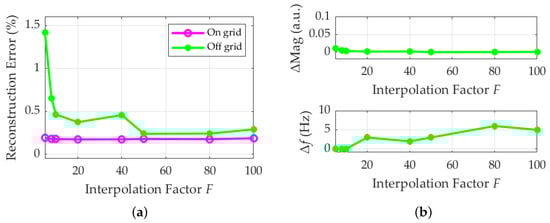 Frequency resolution improvement resulting from different interpolation factor F. (a) Interpolation factor F vs. Reconstruction errors, (b) Interpolation factor F vs. Estimation errors.