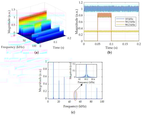 Figure 6a is the 3-D spectrogram reconstructed using the MMV-BCS algorithm with a 200 Hz frequency resolution, and the reconstructed results are consistent with the set values. From Figure 6a, the supraharmonic components contained in the signal and fluctuating characteristics of each supraharmonic component with time can be clearly represented. In Figure 6b, the fluctuating characteristics of three supraharmonic components in the model are presented, and the 50.2 kHz supraharmonic component has an intermittent characteristic. The DFT spectrum of the 200 ms signal is shown Figure 6c. Although the frequency resolution is 5 Hz, it is impossible to reflect the fluctuation characteristics of the supraharmonic components, and there is also a serious spectrum leakage. Since the spectrum calculates the average value of 200 ms, for the 50.2 kHz supraharmonic component, the magnitude is a quarter of the set magnitude in Figure 6b, only about 0.2 a.u. Obviously, if DFT analysis is used, it could yield a misleading supraharmonic amplitude estimation when the signal is not continuous. This could cause unexpected interference and malfunction for the electrical device if the supraharmonic source is not located and filtered. The MMV-BCS algorithm can address such issues successfully.