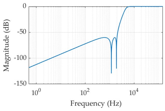 To avoid contributions from the fundamental component of the current signal in the PV inverter, the intercepted 200 ms sampling signal is filtered to remove the fundamental component with a Chebyshev II high-pass digital filter recommended by IEC 61000-4-30, as shown in Figure 7, which is the magnitude frequency response characteristic curve of the Chebyshev II high-pass digital filter. The cut-off frequency is set to 2 kHz, and the stop-band attenuation is −60 dB. Using this filter, 99.9 % of the fundamental component is filtered out.