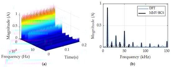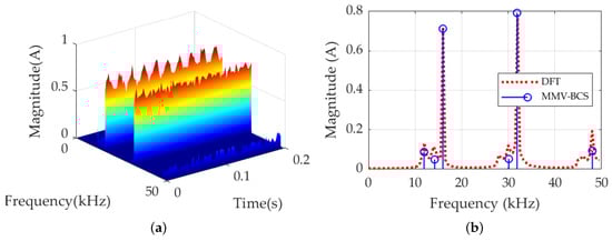 Figure 9a is the 3-D spectrogram of the supraharmonics obtained by the MMV-BCS algorithm with a 25 Hz frequency resolution, and it can be seen that the spectrum leakage can be suppressed significantly compared to the DFT algorithm. There are two main supraharmonic components, and the magnitude of each supraharmonic component has a fluctuating characteristic. Figure 9b is the average spectrum of the reconstructed 100 sets of high-resolution spectra. Two major peaks are obtained: at 15.97 kHz, the magnitude of the supraharmonic component is 0.7134 A, and at 31.93 kHz, the magnitude of the supraharmonic component is 0.7925 A. Some adjacent small supraharmonic components are also successfully detected.
