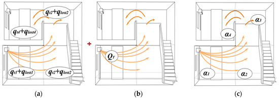 Conceptual diagram of the proposed method. (a) Calculation of heat quantity using CFD; (b) The heat input by the air conditioner; (c) Coefficient of thermal diffusion.